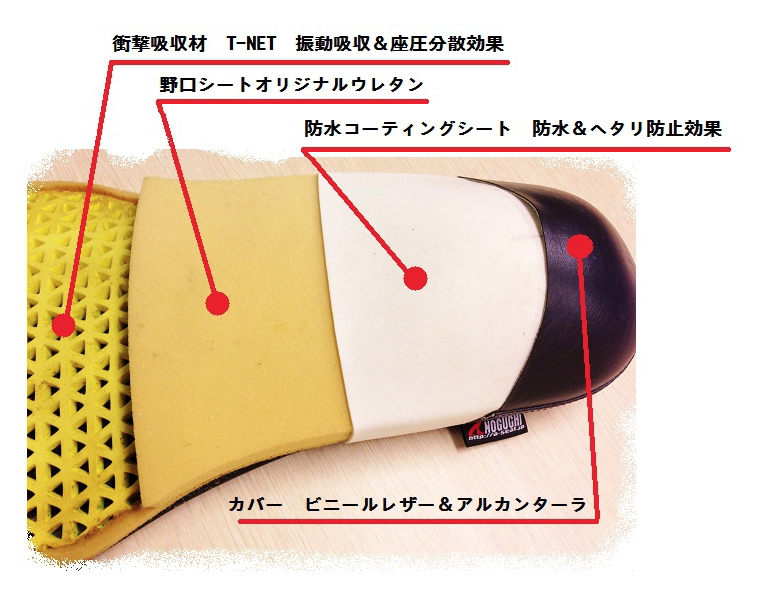 柔らかくすると沈み込みが大きくなり、ベースとなるウレタンとの相性が悪いと単に表面が柔らかくなっただけで、しばらく乗っていると柔らかいのに硬く感じることがあるので、そんな時は柔らかいウレタンとベースとなるウレタンの間にT-NETを使用することにより、硬さは改善され適度な位置で尻を固定し、座圧の分散とポジションの安定を図る。